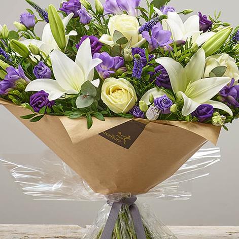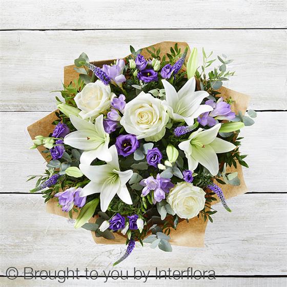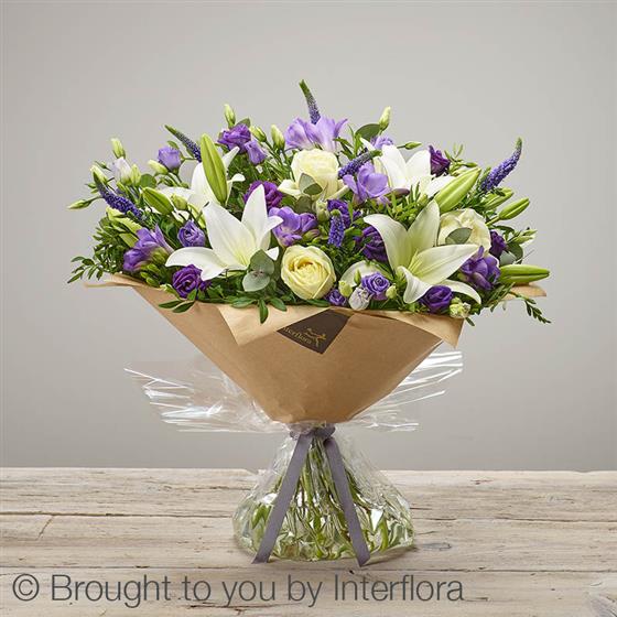 Featuring white LA lily, ivory large headed rose, purple freesia, blue veronica, purple lisianthus, eucalyptus & pistache, presented in Interflora gift packaging.