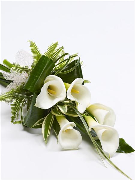 Classic white calla Lily tied with a natural ribbon are complemented by folded aspidistra leaves and dracaena to create this contemporary sheaf.