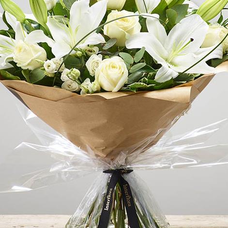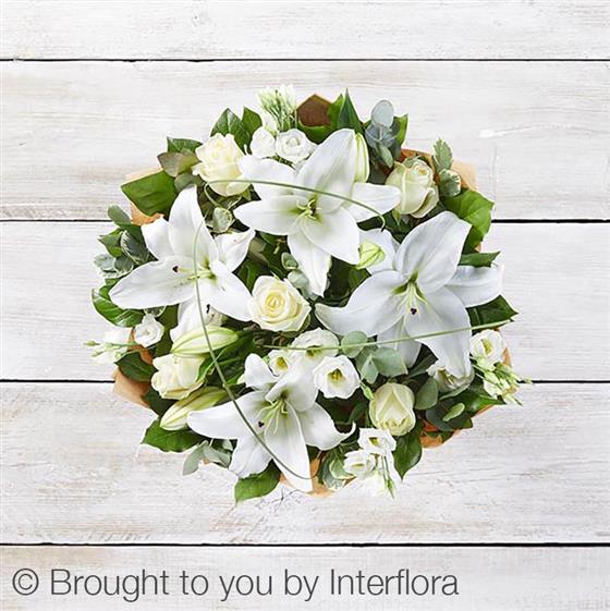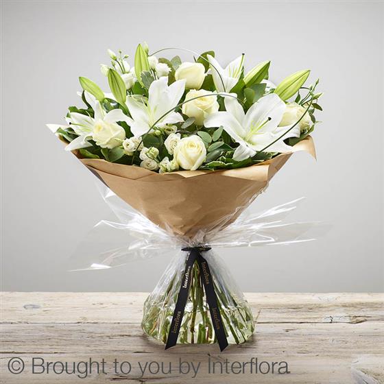 Featuring Ivory Large Headed Roses, white Oriental lilies and white lisianthus hand-tied with steel grass, salal, eucalyptus and pittosporum and presented in Interflora Gift Packaging.