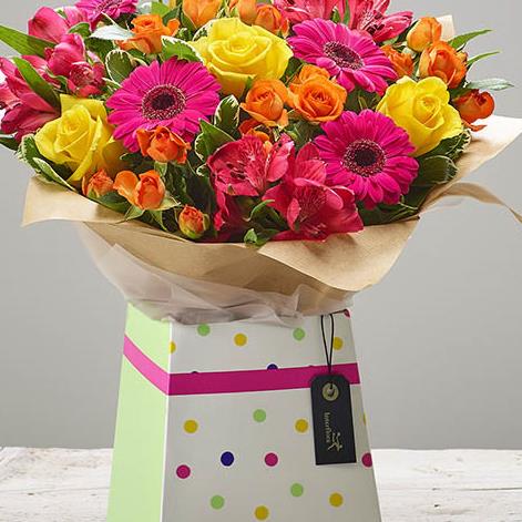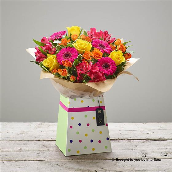 Featuring yellow large headed roses, orange spray roses, cerise alstroemeria and cerise germini with salal and pittosporum, presented in a gift box.