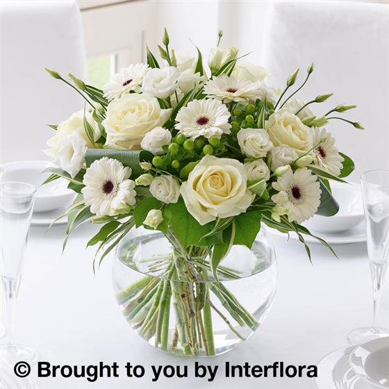 Purest white flowers interspersed with lush greenery create an effortlessly chic display. This stylish centrepiece exudes natural beauty, with a sense of balance and symmetry that is ultra-fashionable.