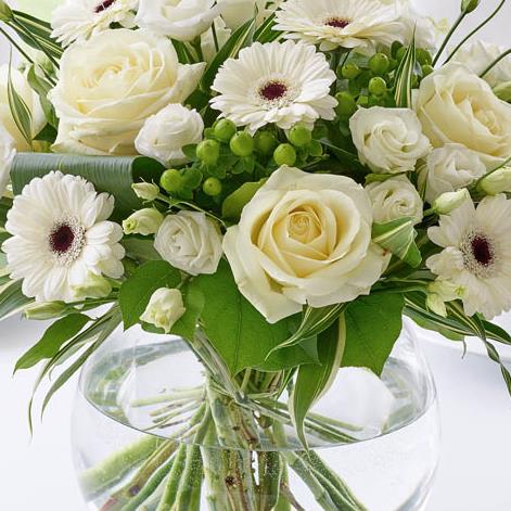 Featuring 6 white germini, 2 green hypericum, 3 white lisianthus and 5 white large headed roses with folded aspidistra leaves, variegated dracaena and salal presented in a large globe glass vase.