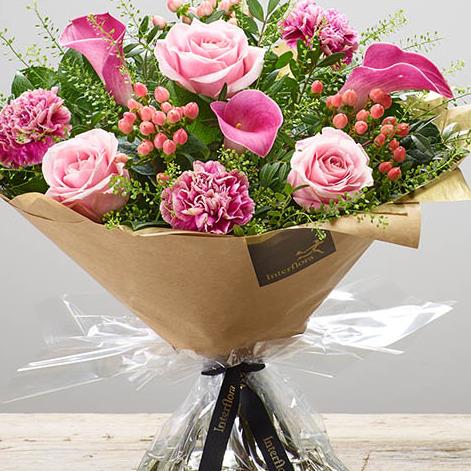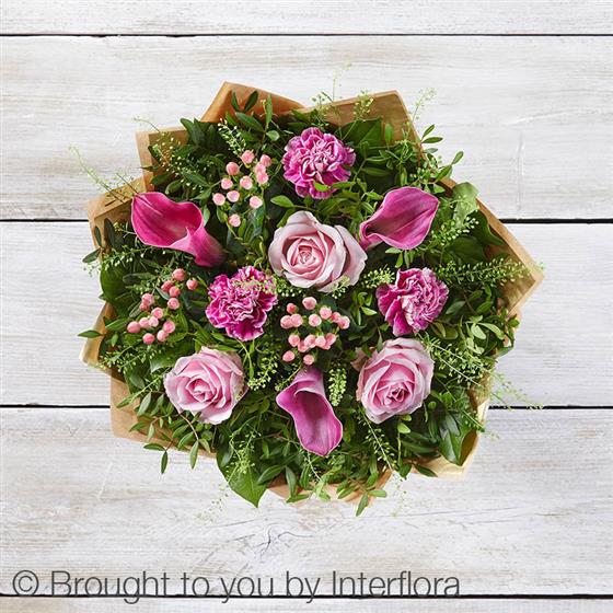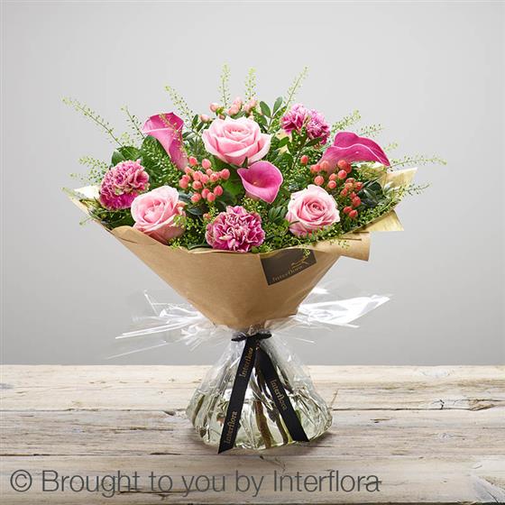 Featuring pink calla lilies, pink two-tone carnations, pink large headed roses, and peach hypericum, hand-tied with thlaspi, pistache and salal, and presented in Interflora Gift Packaging.