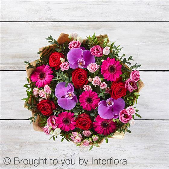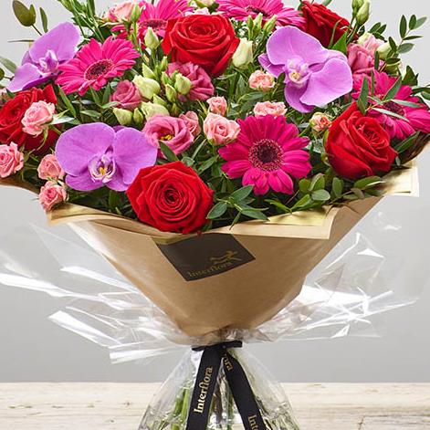 Featuring pink phalaenopsis orchids, red large headed roses, pink spray roses, pink lisianthus and cerise germini, hand-tied with eucalyptus and pistache, and presented in Interflora Gift Packaging.