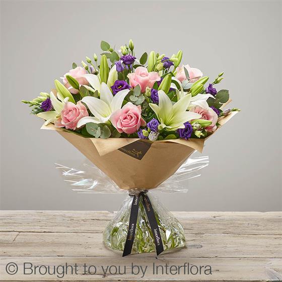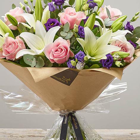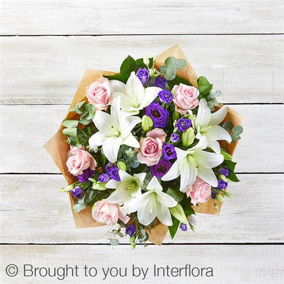 Featuring pink large headed roses, white LA lilies and purple lisianthus, hand-tied with eucalyptus and salal, and presented in Interflora Gift Packaging.