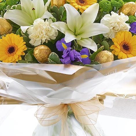 Featuring green spray chrysanthemums, yellow germini, blue iris, a cream LA lily and cream carnations with salal, pittosporum and foil-covered chocolate Easter eggs, wrapped and presented in Interflora Gift Packaging.