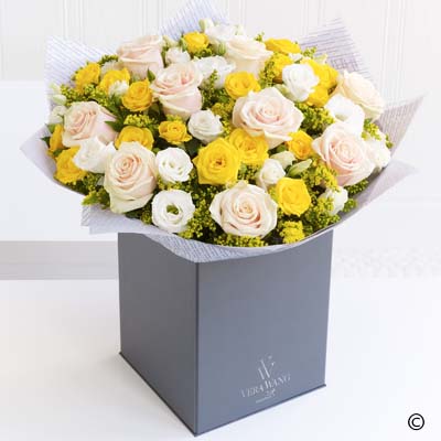Featuring Talea apricot roses, white double lisianthus and Shine yellow spray roses, expertly hand-tied with solidago, and finished with luxurious Vera Wang gift wrapping.