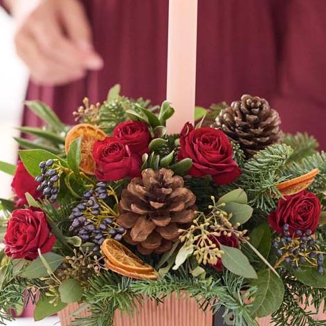 Send them flowers fit for the Christmas table. This beautiful arrangement arranged by our top florists will be bespoke made with fresh flowers delivered daily, that center's around a festive candle.