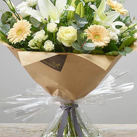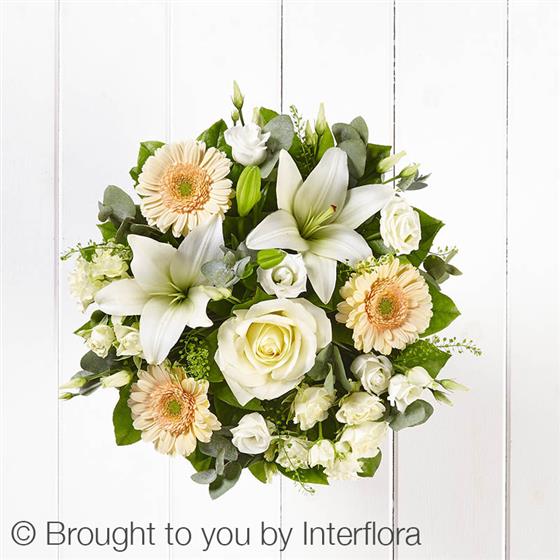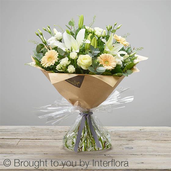 Featuring white LA lilies, ivory large headed roses, white lisianthus, white spray roses, cream germini and thlaspi green bell with eucalyptus and salal, hand-tied, gift-wrapped.