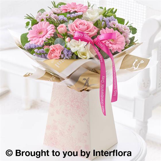 Featuring white freesia, pink germini, pink medium headed rose, light pink spray carnation, pink spray chrysanthemums and lilac statice with rosemary, salal tips and eucalyptus, presented in a floral design gift box and trimmed with ‘Happy Grandparents' Day’ ribbon.