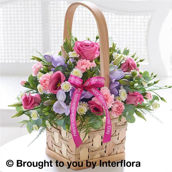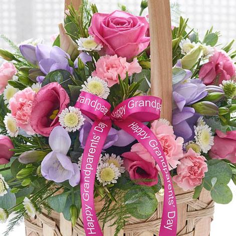 Featuring light pink spray carnations, white spray chrysanthemum, lilac freesia, pink lisianthus and pink large headed roses with asparagus fern, eucalyptus and rosemary, presented in a natural softwood and bamboo basket trimmed with ‘Happy Grandparents' Day’ ribbon.