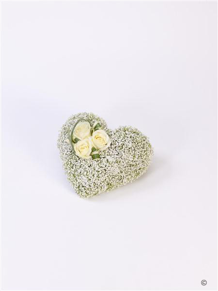 This white heart shaped tribute is a simple and very graceful design. Three perfect cream large-headed roses trimmed with China grass are carefully set on a bed of delicate white gypsophila flowers.
