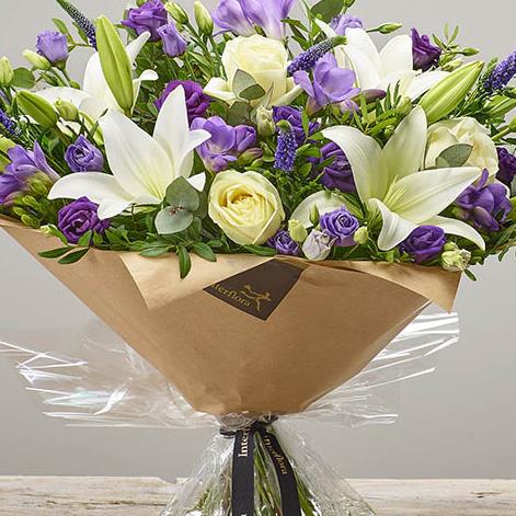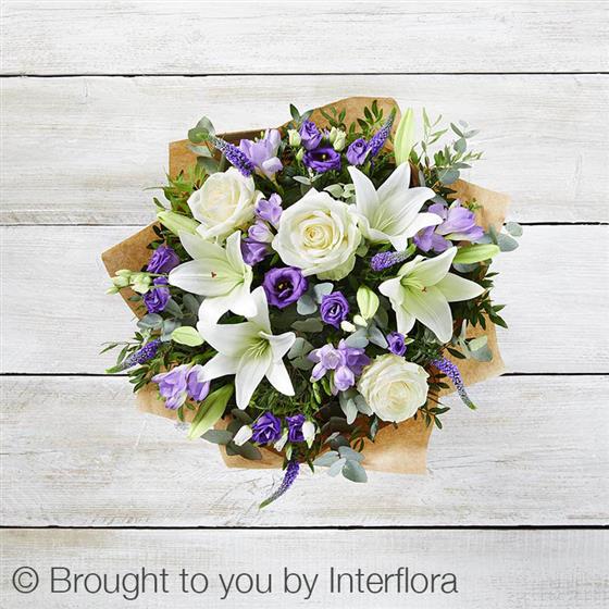 Featuring white LA lily, ivory large headed rose, purple freesia, blue veronica, purple lisianthus, eucalyptus & pistache, presented in Interflora gift packaging.