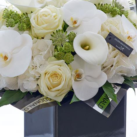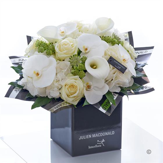 Featuring 3 white glittered hydrangea, 5 white large headed roses, 3 white calla lilies, 5 white phalanopsis orchids and 3 white astrantia with aralia and salal, presented in Julien Macdonald foil wrap and a dual-branded gift box with designer gift tag and ribbon. This hand-tied is tightly constructed to create a neat, compact posy of flowers.