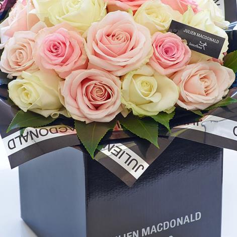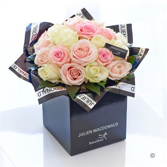 Featuring 8 light pink large headed roses, 8 white large headed roses and 8 pink large headed roses with aralia, presented in Julien Macdonald foil wrap and a dual-branded gift box with designer gift tag and ribbon. This hand-tied is tightly constructed to create a neat, compact posy of flowers.