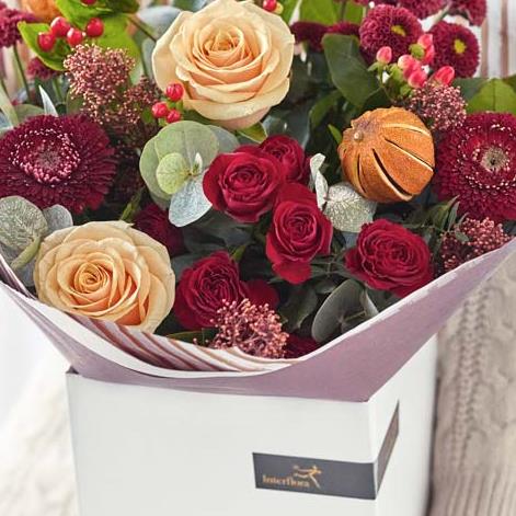 A gorgeous bouquet crafted by their local florist, featuring blooms in rich red and green shades, with peach and cream highlights and pops of burgundy and cerise.