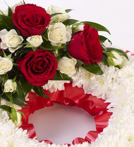 A classic circular wreath covered with a mass of white double spray chrysanthemums and finished with a red and white spray of roses and spray roses and finished with a red ribbon trim. Approximate diameter 44cm (17 inches).