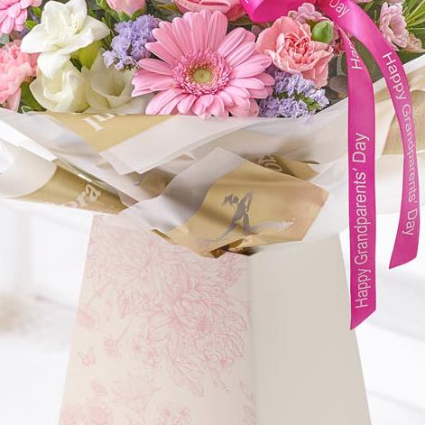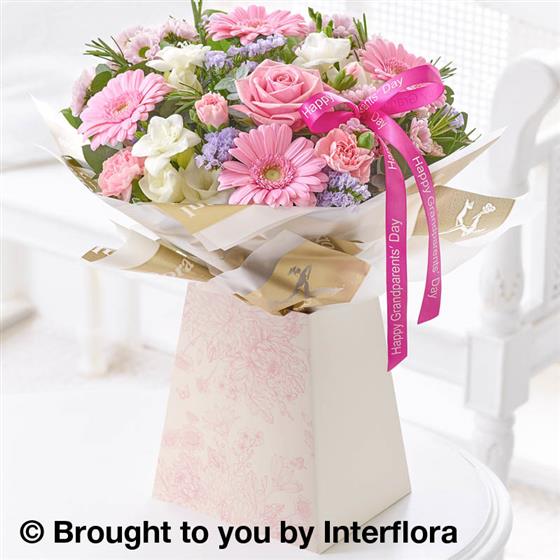 Featuring white freesia, pink germini, pink medium headed rose, light pink spray carnation, pink spray chrysanthemums and lilac statice with rosemary, salal tips and eucalyptus, presented in a floral design gift box and trimmed with ‘Happy Grandparents' Day’ ribbon.