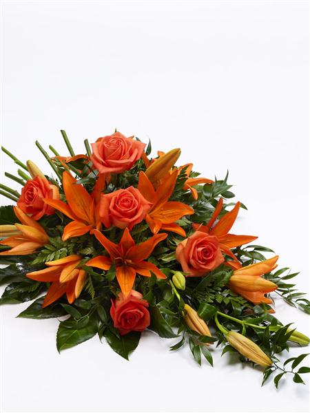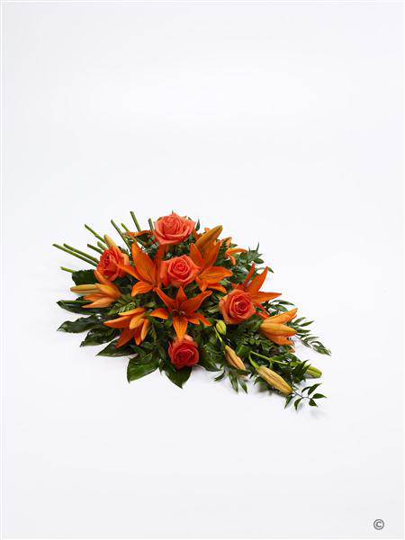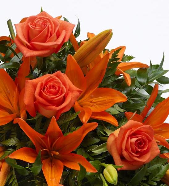 Aralia leaves and French ruscus are nestled amongst classic orange Oriental Lily and orange large-headed roses in this classic teardrop spray.