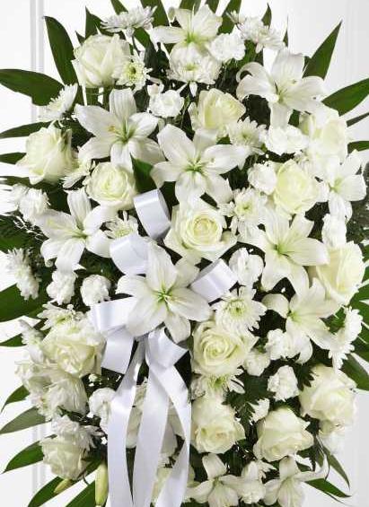 This exquisite standing spray in white and green includes roses, Asiatic Lily, spray chrysanthemums and spray carnations arranged amongst palm fronds and lush greens. Accented by white satin ribbon and standing on a wire easel, this standing spray will make a truly beautiful addition to the service.