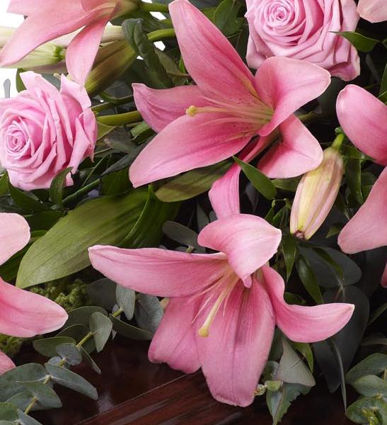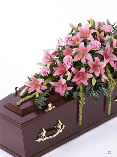 Beautiful Asiatic Lily and large-headed Rose in pretty pink are used to create this elegant casket spray. The fresh flowers are enhanced with trails of green amaranthus as well as ruscus, aralia leaves and eucalyptus. Approximate height 153cm (5ft).