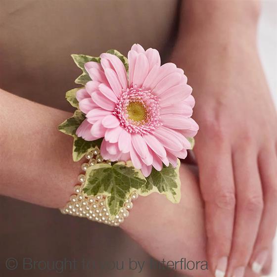 This beautiful germini wrist corsage in palest pink is sure to be worn with pride. A delightful modern twist on the tradtional corsage, this bracelet version looks particularly pretty and would suit wedding guests of all ages.