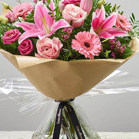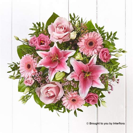 Featuring pink Oriental lilies, pink large-headed roses, pink spray roses, pink lisianthus and white ammi, hand-tied with eucalyptus and salal and presented in Interflora Gift Packaging.