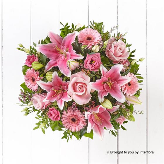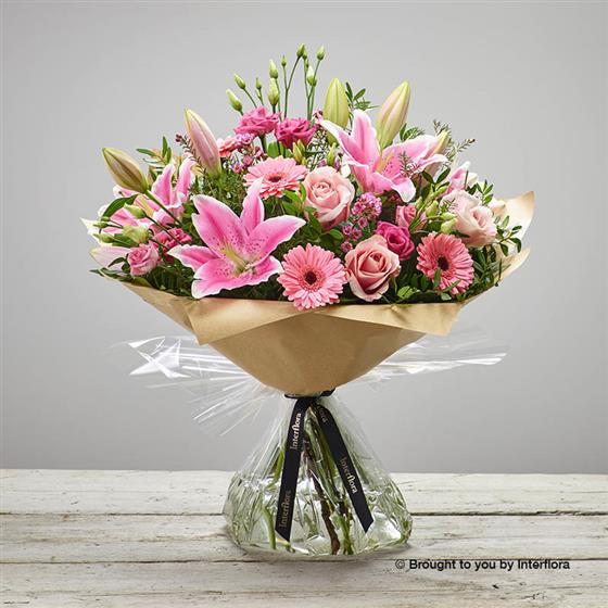 Featuring pink Oriental lilies, pink large-headed roses, pink spray roses, pink lisianthus and white ammi, hand-tied with eucalyptus and salal and presented in Interflora Gift Packaging.