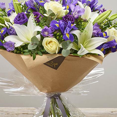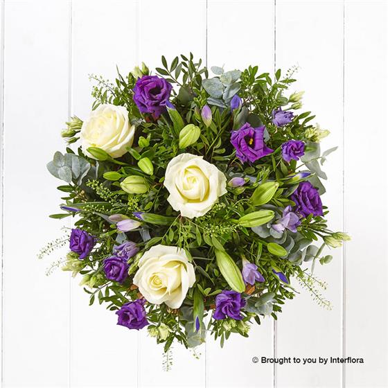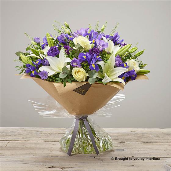Featuring ivory large headed roses, purple freesia, blue iris, white lilies, purple lisianthus and thlaspi hand-tied with eucalyptus and pistache, finished with gift wrap and ribbon, presented in Interflora gift packaging.