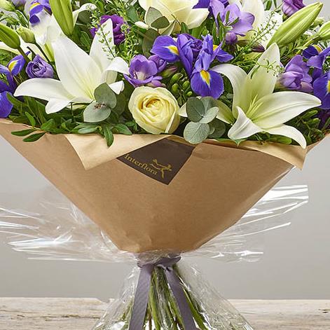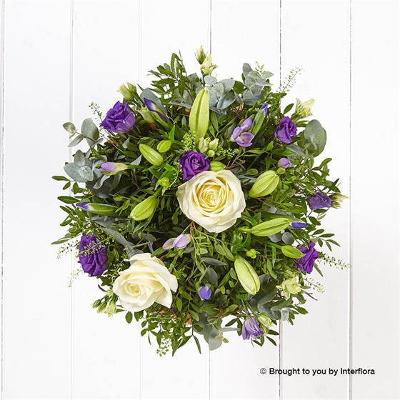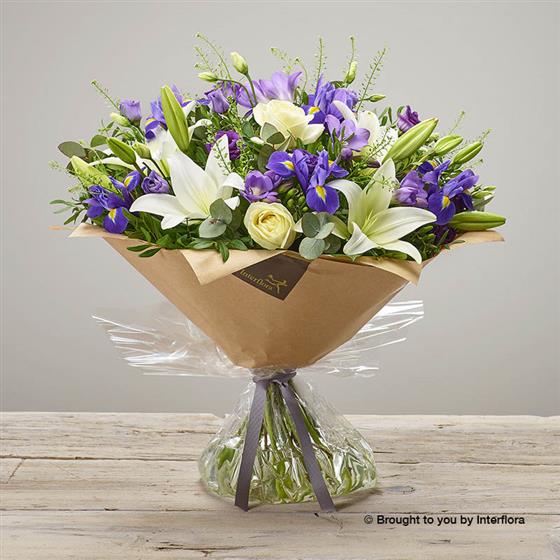 Featuring ivory large headed roses, purple freesia, blue iris, white lilies, purple lisianthus and thlaspi hand-tied with eucalyptus and pistache, finished with gift wrap and ribbon, presented in Interflora gift packaging.