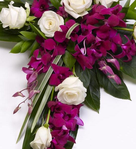 Roses and Dendrobium orchids are arranged on a cross of aspidistra leaves to create this unusual design in cerise, white and green. Approximate height 92cm (3ft).