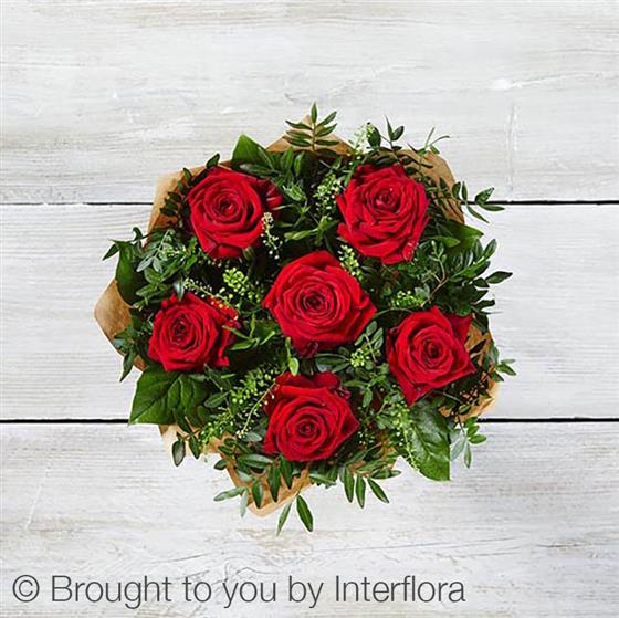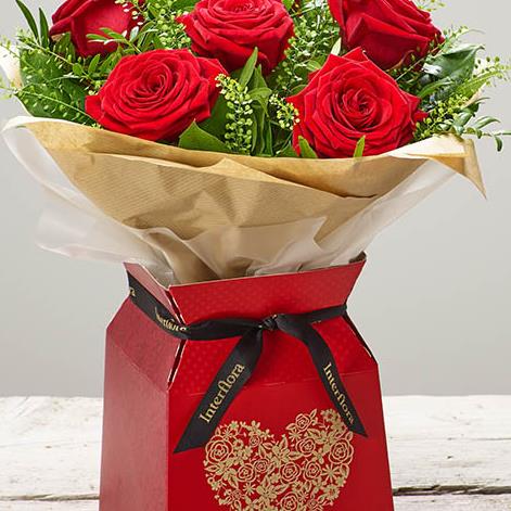 Featuring red large headed roses with thlaspi, pittosporum and salal, presented in a pretty gift box.