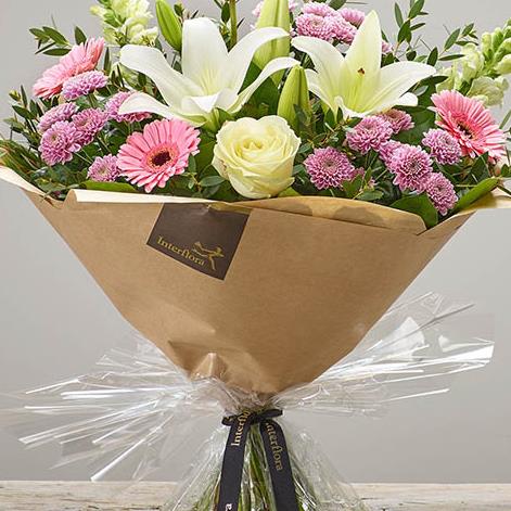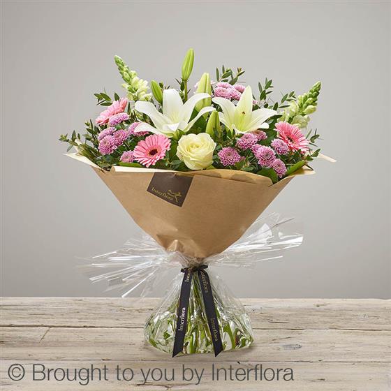 Featuring white LA lilies, Ivory Large Headed Roses, pink spray chrysanthemums, white antirrhinums and pink germini, hand-tied with eucalyptus and salal, wrapped and presented in Interflora Gift Packaging.