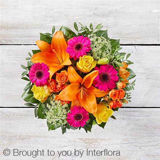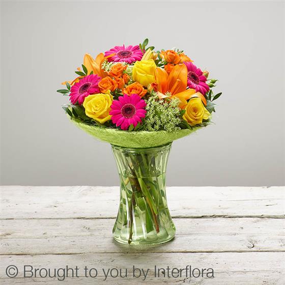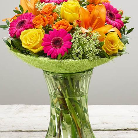 Featuring cerise germini, yellow large-headed roses, green ammi, an orange Asiatic lily and orange spray roses with salal and pistache, in a lime curved glass vase with a lime green sisal collar.