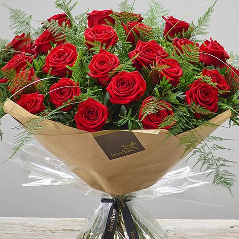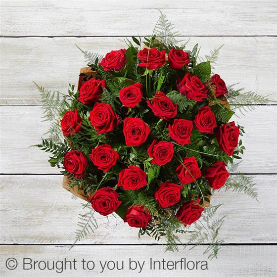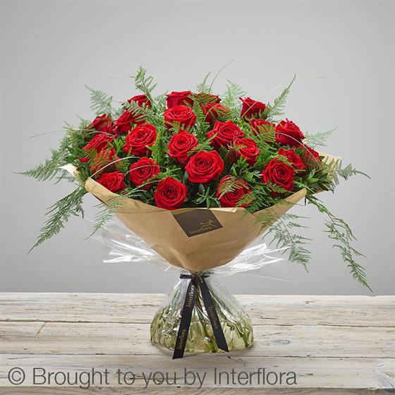 Featuring large headed red roses hand-tied with asparagus fern, bear grass and pistache, and presented in Interflora Gift Packaging.