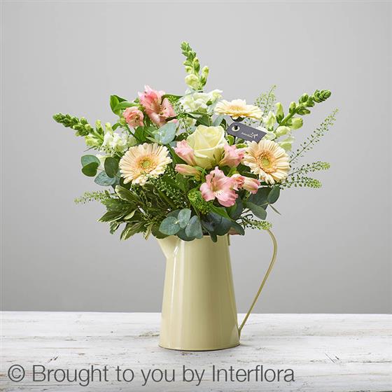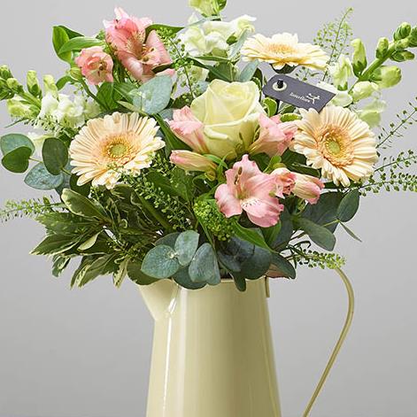 Featuring an ivory large headed rose, pink alstroemeria, white antirrhinum, cream germini and thlaspi green bell with eucalyptus and pittosporum, arranged in a cream tin jug.