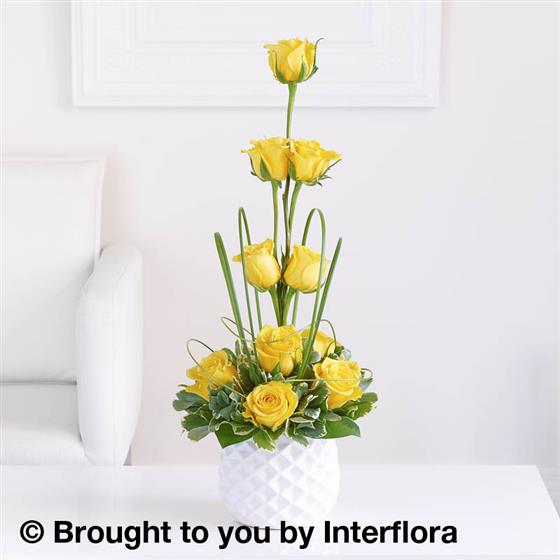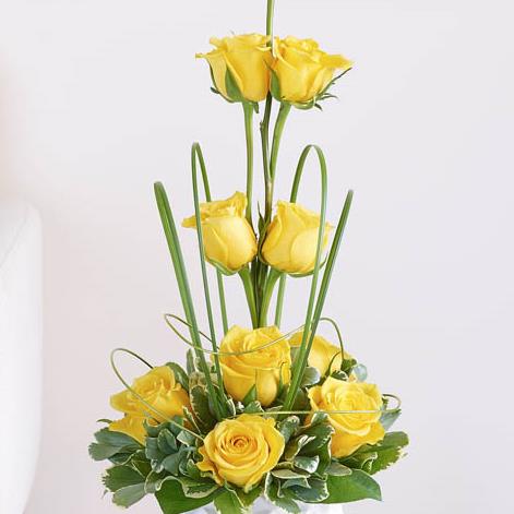 This modern arrangement of golden yellow roses is a wonderful focal point for a modern and stylish home.