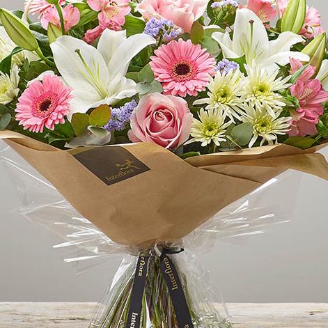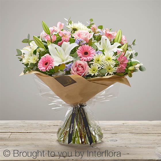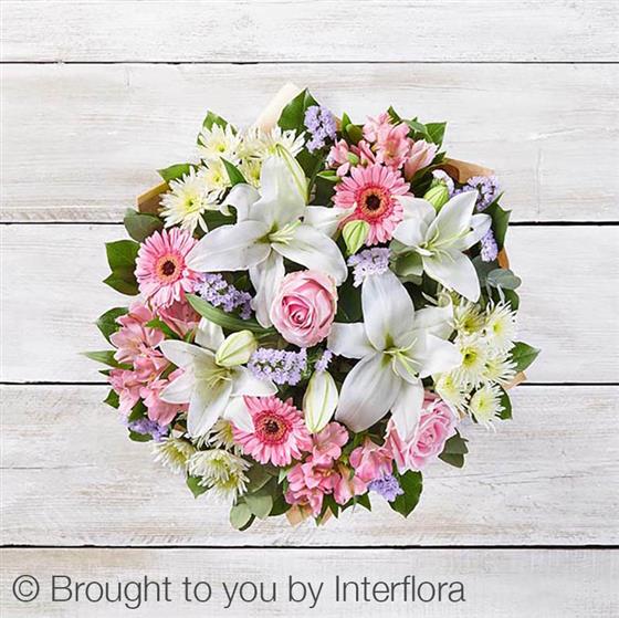 Featuring pink alstroemeria, white Oriental lilies, pink large headed roses, white spray chrysanthemums, lilac statice and pink germini with eucalyptus cinerea and salal, presented in Interflora Gift Packaging.