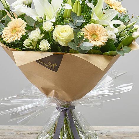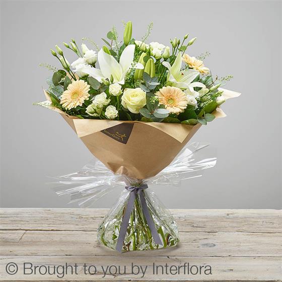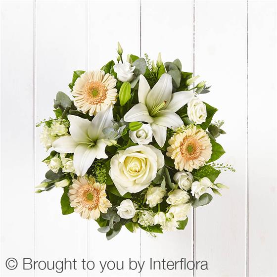 Featuring ivory large headed roses, white lisianthus, white spray roses, white LA lily, peach germini and thlaspi, hand-tied with eucalyptus and salal, finished with gift wrap and ribbon, presented in Interflora gift packaging.