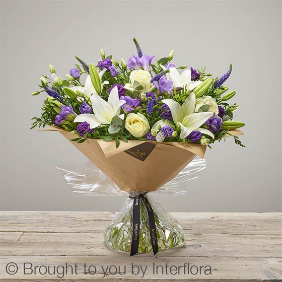 Featuring white LA lily, ivory large headed rose, purple freesia, blue veronica, purple lisianthus, eucalyptus & pistache, presented in Interflora gift packaging.