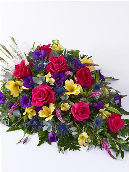 Large-headed roses, lisianthus, alstroemeria and veronica in pretty pinks, lilacs and creams are set off by blue eryngium, luxury foliages and a natural ribbon bow to create this woodland spray.